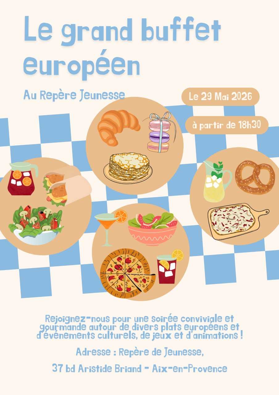 Dans le cadre du joli mois de l’Europe, nous vous invitons à partager sur des grandes tables un grand buffet européen avec entrées, plats, desserts avec des prestations culturelles et animations européennes tel un dîner spectacle aux couleurs de l’Europe.