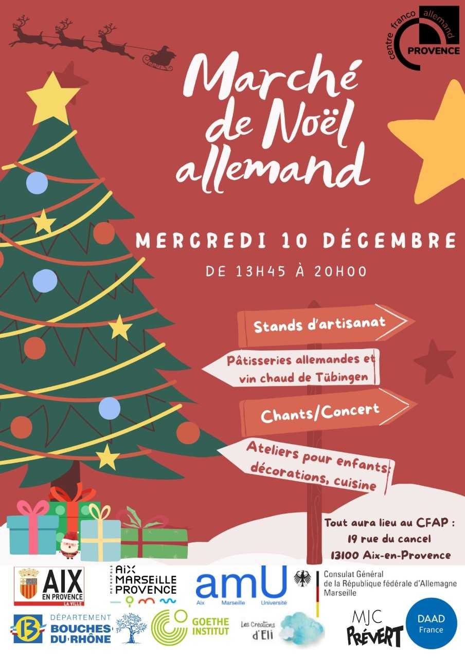 Marché de Noël / Weihnachtsmarkt avec programme pour enfants et jeunes l’après-midi Au programme: 🖍️13h45 à 14h45: Atelier de dessin autour de la Saint-Nicolas avec le dessinateur Thomas Bianco (sur inscription au 04 42 21 29 12 ou à info@cfaprovence.com) ✨de 15h00 à 17h30: Décoration de gâteaux de Noël / Création de décoration de Noël en libre accès 🎵18h00: Concert… Poursuivre la lecture Marché de Noël / Weihnachtsmarkt au Centre Franco-Allemand de Provence